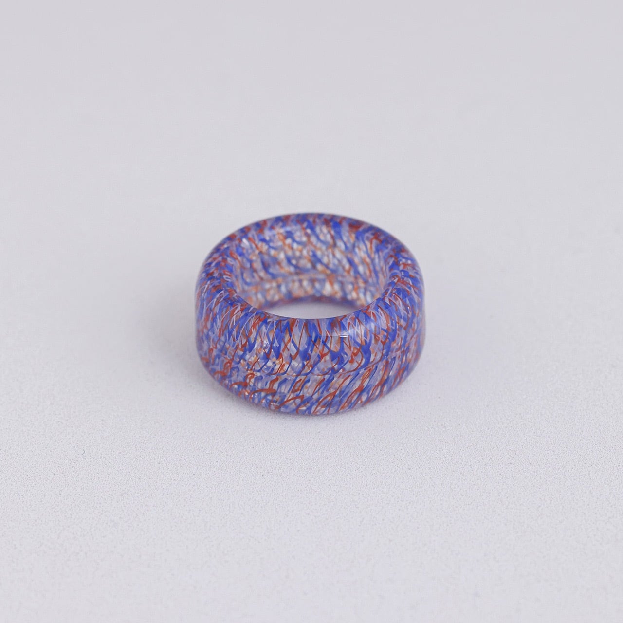 色ガラスが透明のガラスの中でぐるぐると線を描いているように見えます。