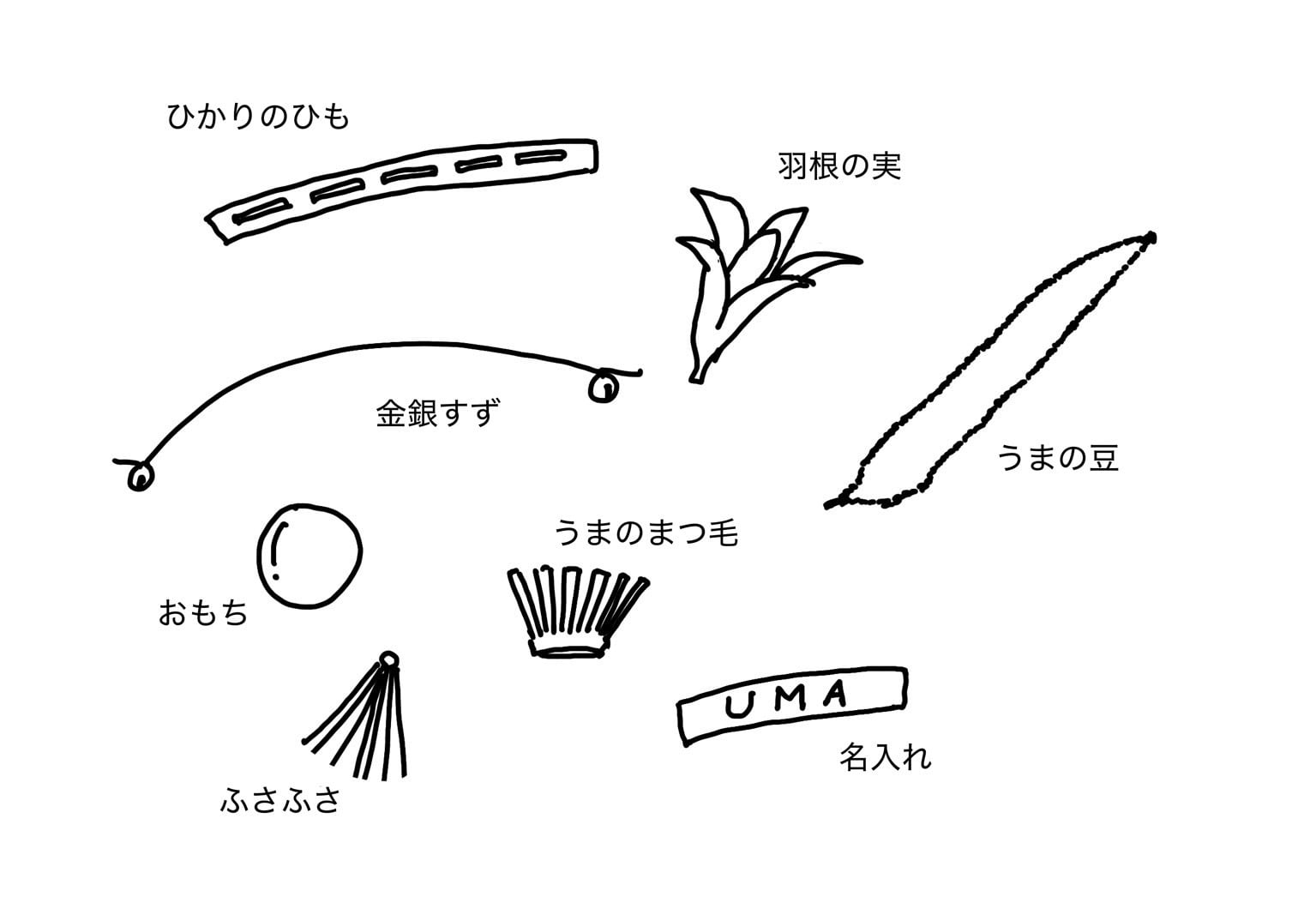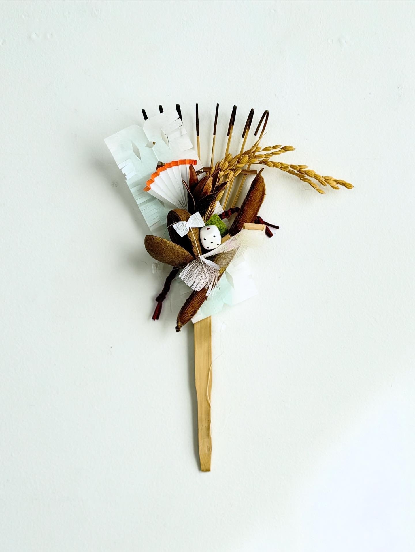 おめでたい屋さん 特別バージョンの熊手です。 お花やはるちゃん(fiore soffitta)と渡邉紘子が制作したり、集めた縁起物を組み合わせています。今年は来年の干支の「馬」をイメージしてモチーフを作りました。白〜ベージュ〜茶色の中にオレンジとグリーンが少し入る色合いに、さまざまな質感のものを散りばめています。