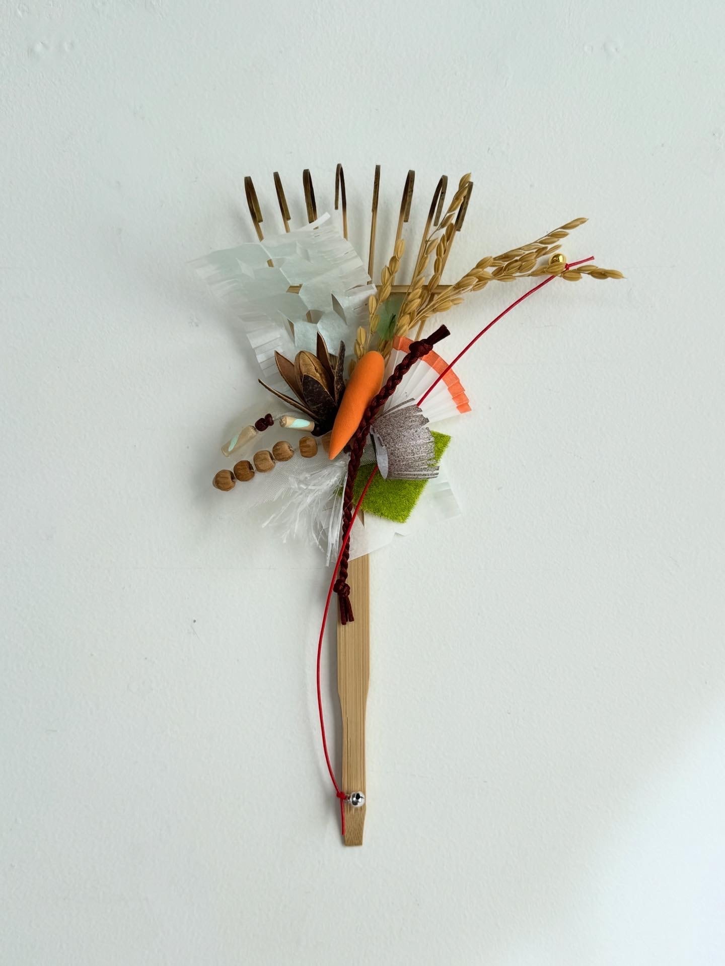 おめでたい屋さん 特別バージョンの熊手です。 お花やはるちゃん(fiore soffitta)と渡邉紘子が制作したり、集めた縁起物を組み合わせています。今年は来年の干支の「馬」をイメージしてモチーフを作りました。白〜ベージュ〜茶色の中にオレンジとグリーンが少し入る色合いに、さまざまな質感のものを散りばめています。