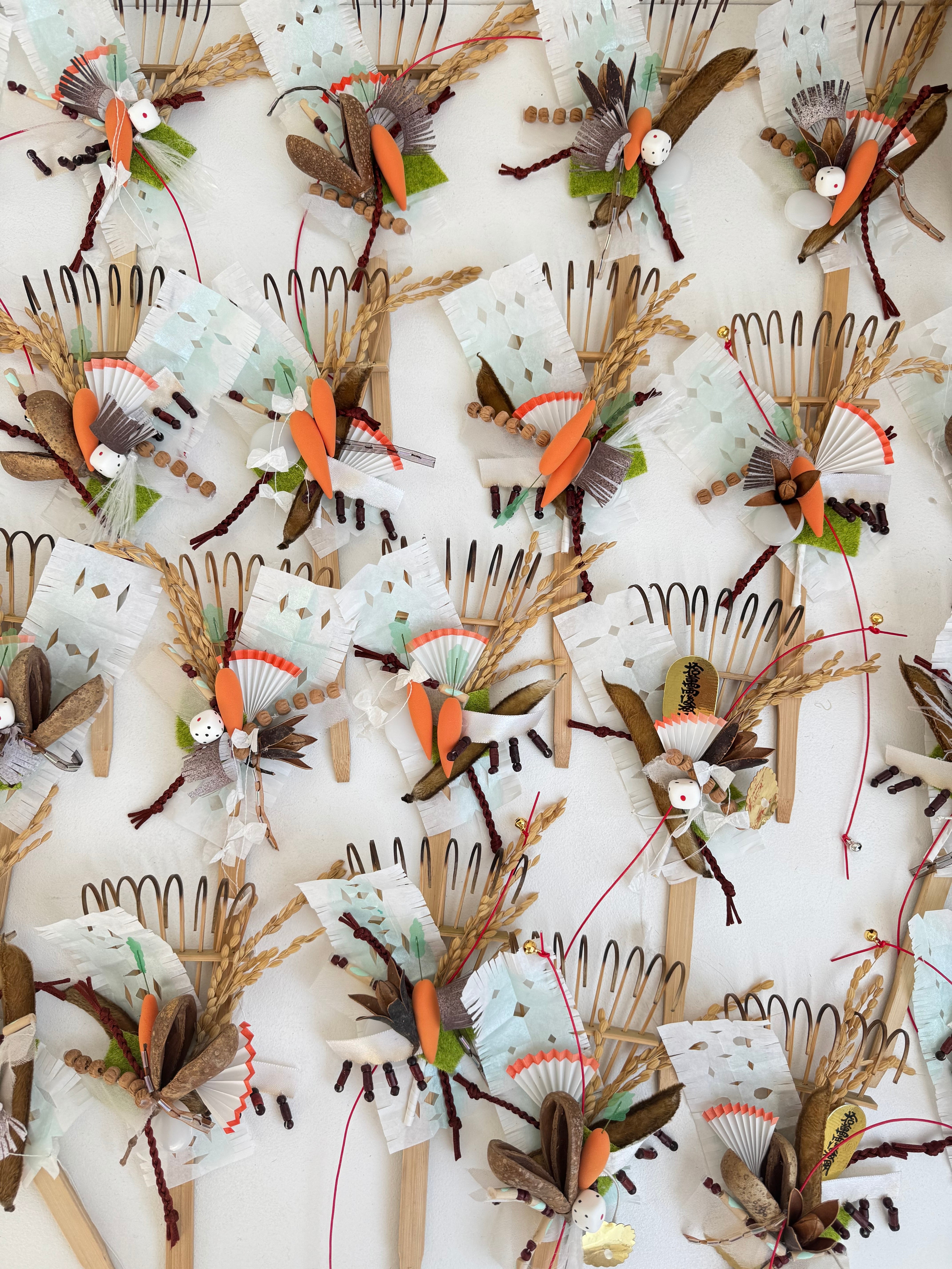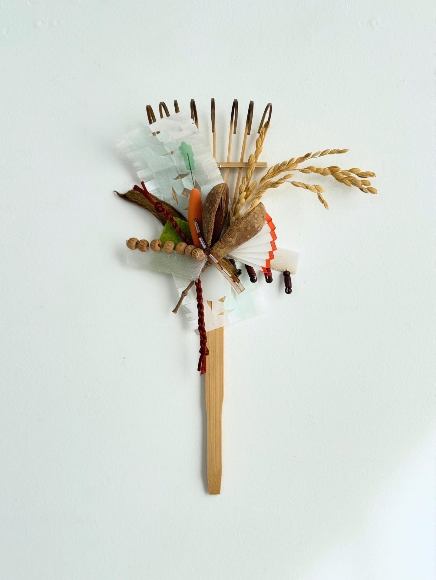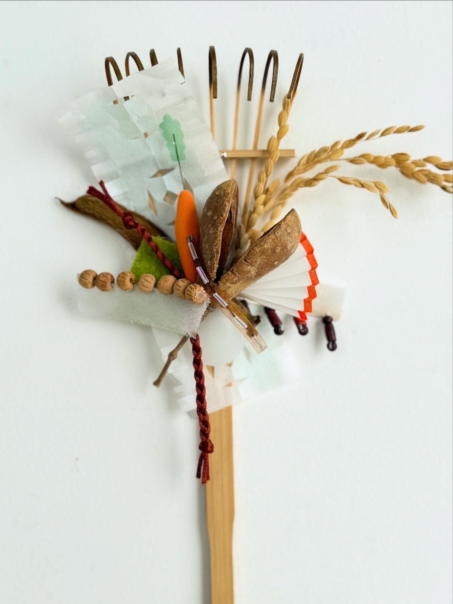 おめでたい屋さん 特別バージョンの熊手です。 お花やはるちゃん(fiore soffitta)と渡邉紘子が制作したり、集めた縁起物を組み合わせています。今年は来年の干支の「馬」をイメージしてモチーフを作りました。白〜ベージュ〜茶色の中にオレンジとグリーンが少し入る色合いに、さまざまな質感のものを散りばめています。