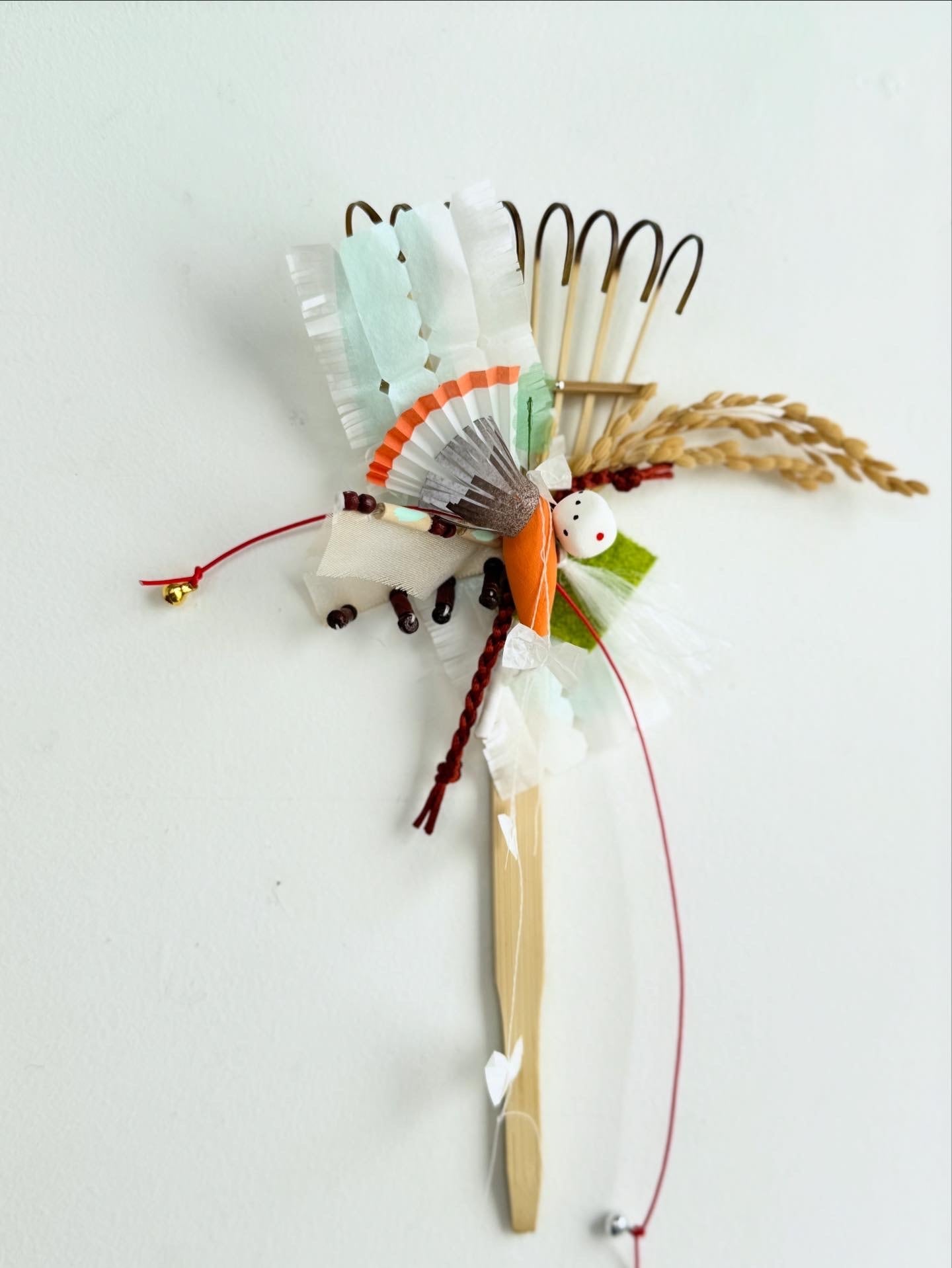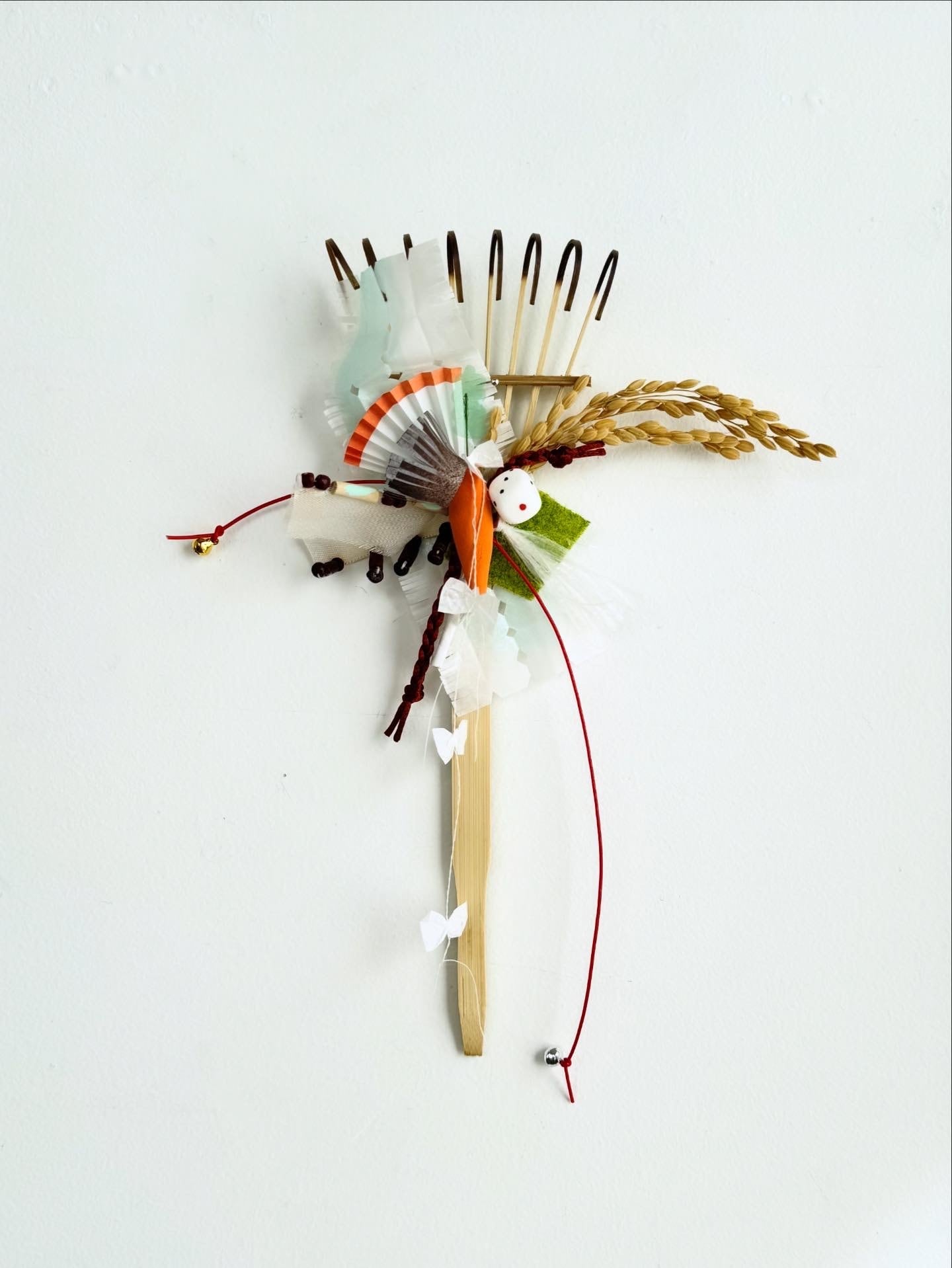 おめでたい屋さん 特別バージョンの熊手です。 お花やはるちゃん(fiore soffitta)と渡邉紘子が制作したり、集めた縁起物を組み合わせています。今年は来年の干支の「馬」をイメージしてモチーフを作りました。白〜ベージュ〜茶色の中にオレンジとグリーンが少し入る色合いに、さまざまな質感のものを散りばめています。