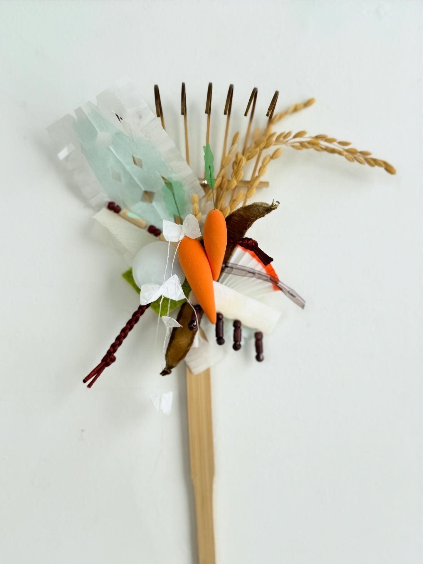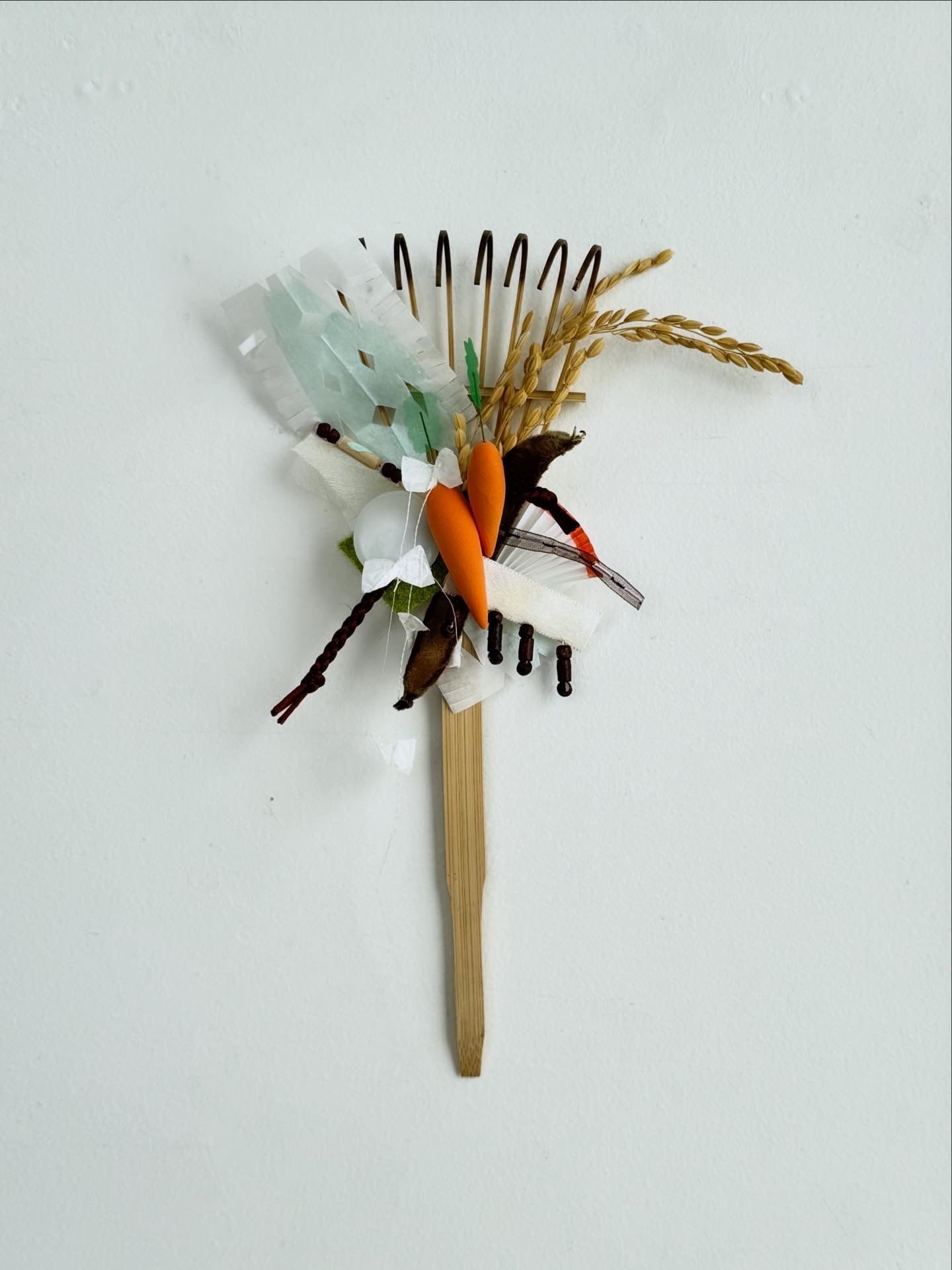 おめでたい屋さん 特別バージョンの熊手です。 お花やはるちゃん(fiore soffitta)と渡邉紘子が制作したり、集めた縁起物を組み合わせています。今年は来年の干支の「馬」をイメージしてモチーフを作りました。白〜ベージュ〜茶色の中にオレンジとグリーンが少し入る色合いに、さまざまな質感のものを散りばめています。