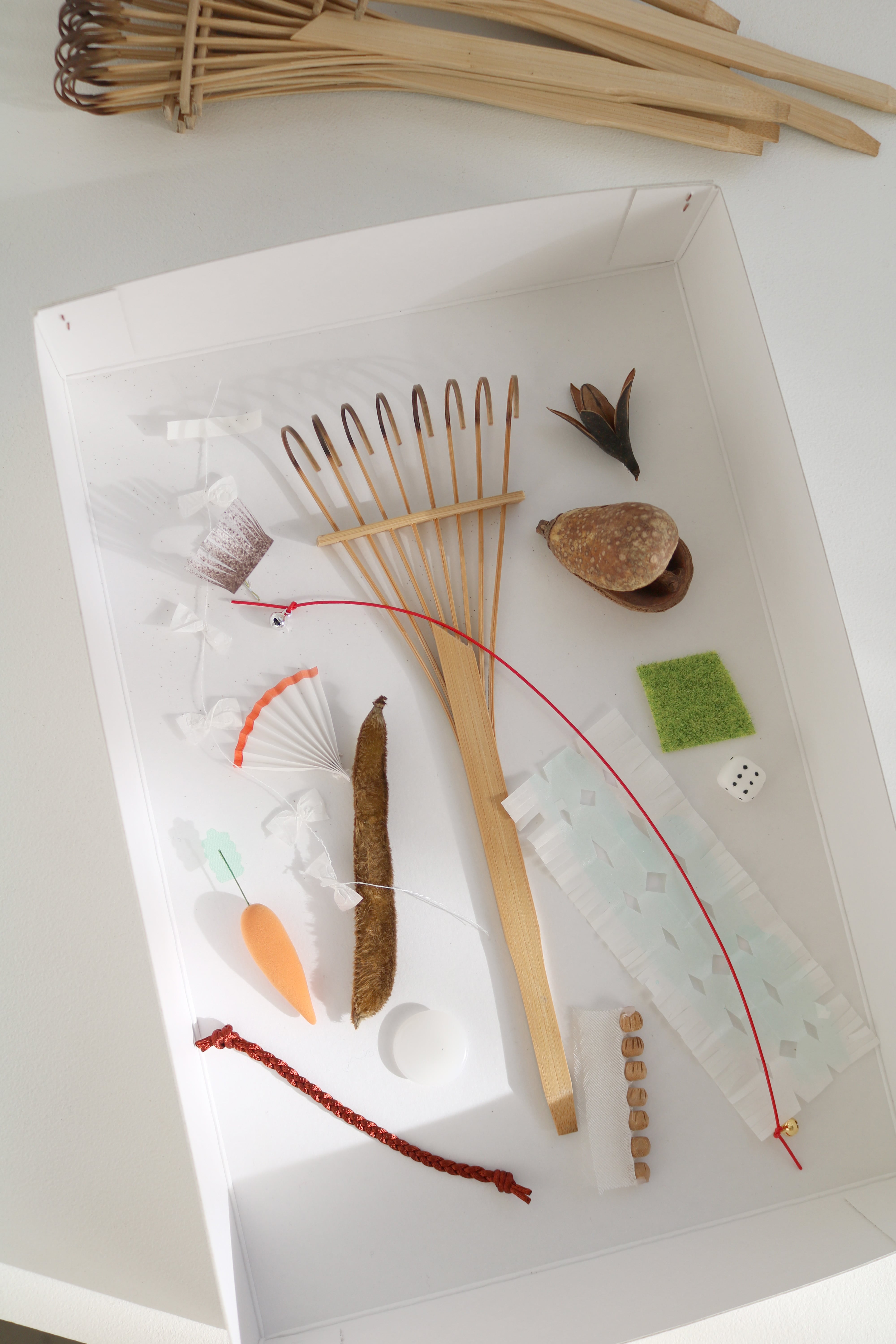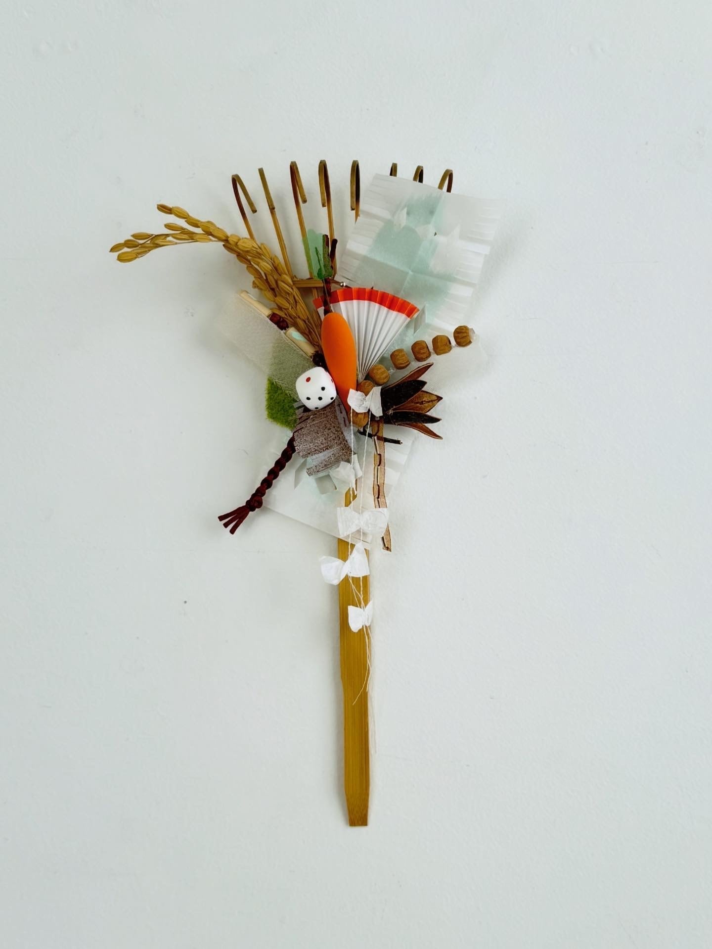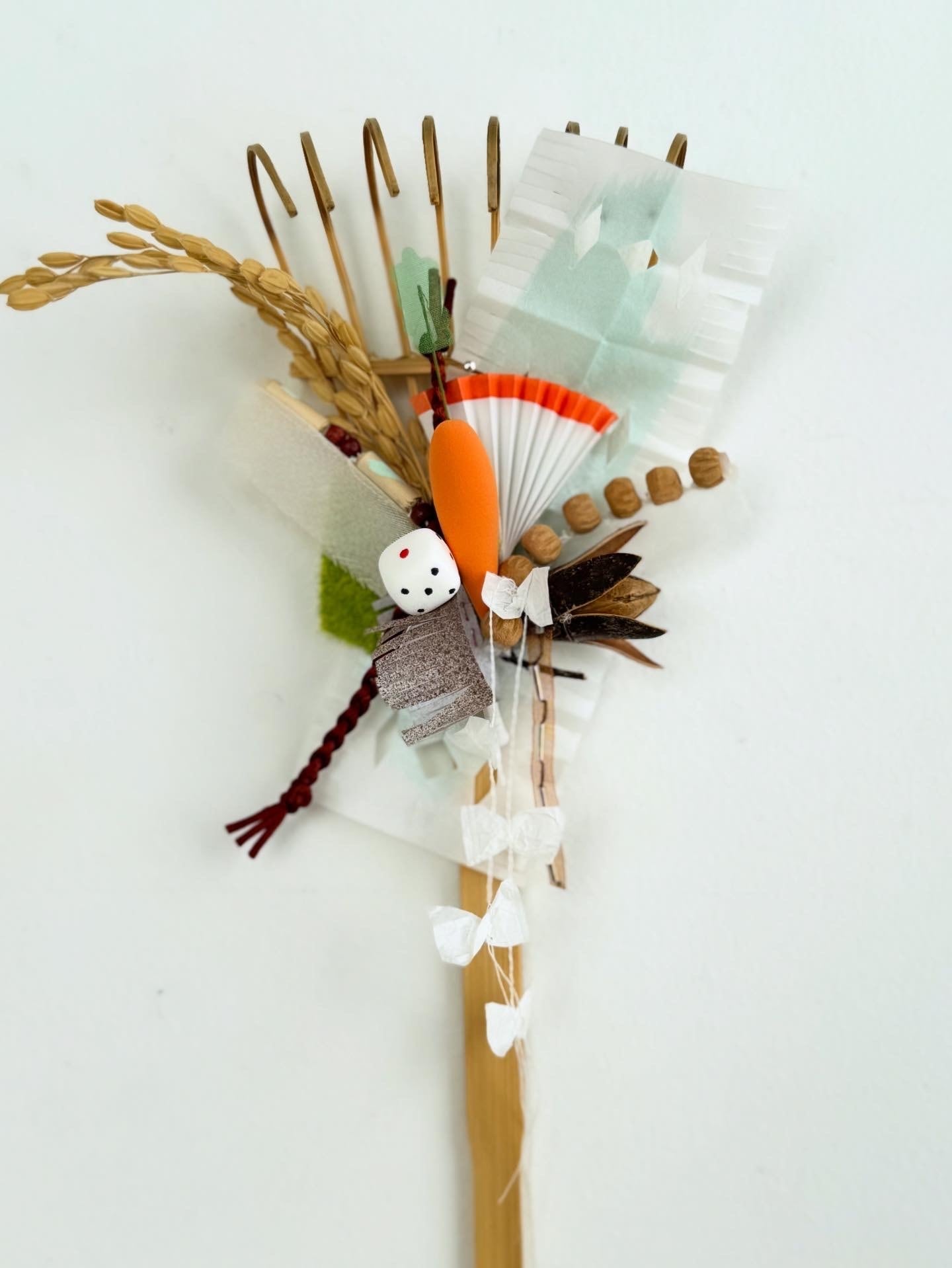 おめでたい屋さん 特別バージョンの熊手です。 お花やはるちゃん(fiore soffitta)と渡邉紘子が制作したり、集めた縁起物を組み合わせています。今年は来年の干支の「馬」をイメージしてモチーフを作りました。白〜ベージュ〜茶色の中にオレンジとグリーンが少し入る色合いに、さまざまな質感のものを散りばめています。