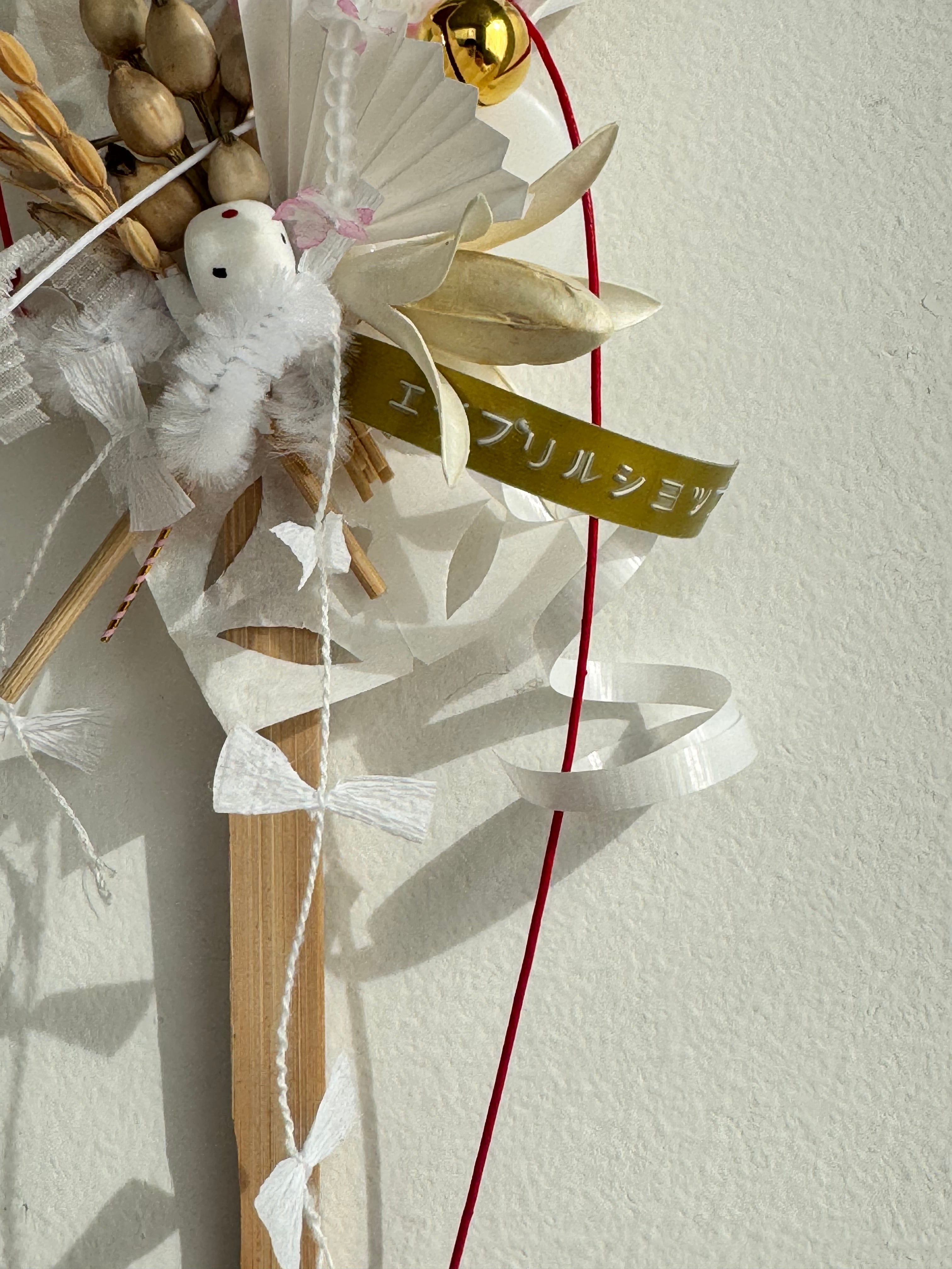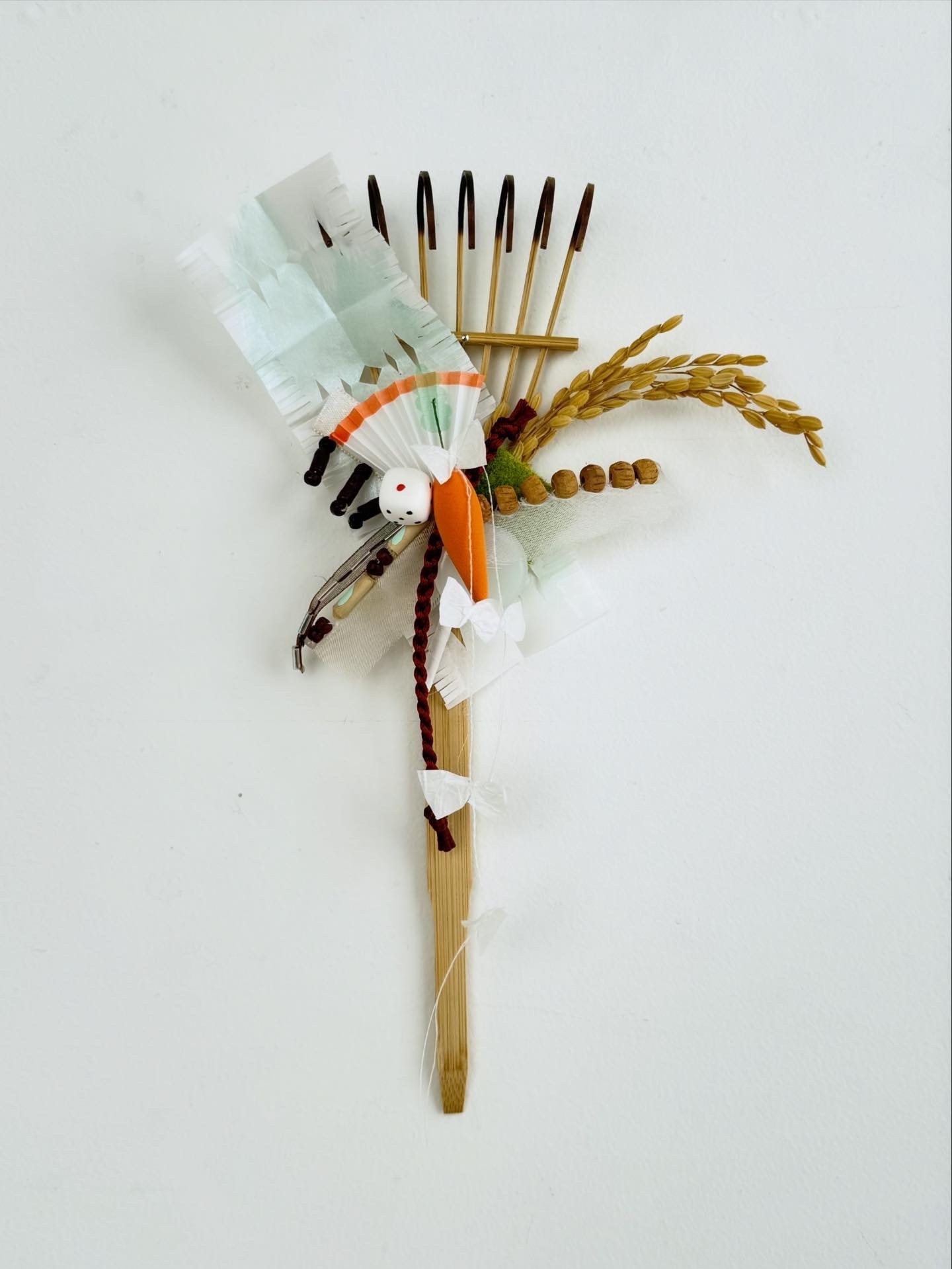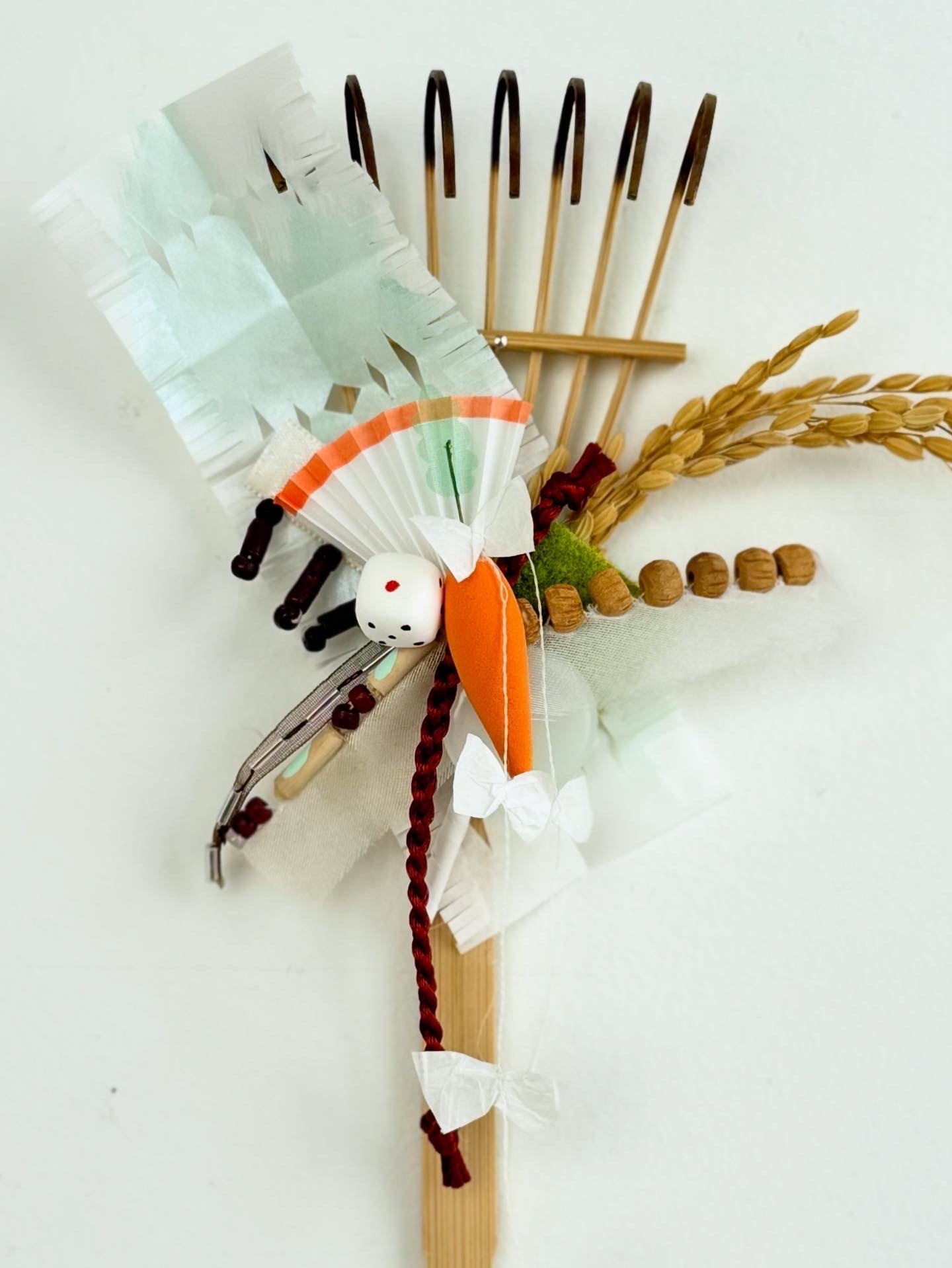 おめでたい屋さん 特別バージョンの熊手です。 お花やはるちゃん(fiore soffitta)と渡邉紘子が制作したり、集めた縁起物を組み合わせています。今年は来年の干支の「馬」をイメージしてモチーフを作りました。白〜ベージュ〜茶色の中にオレンジとグリーンが少し入る色合いに、さまざまな質感のものを散りばめています。