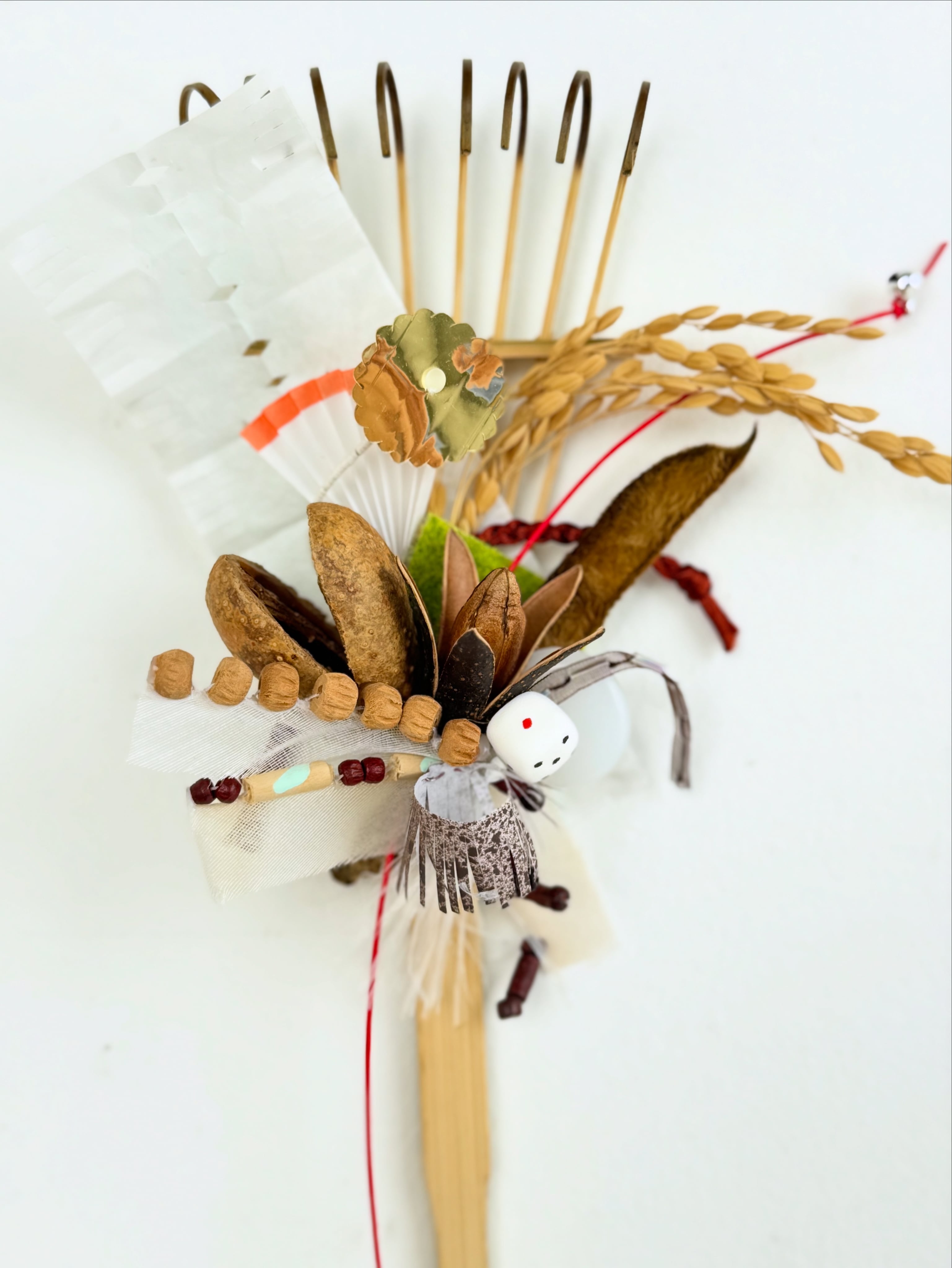 おめでたい屋さん 特別バージョンの熊手です。 お花やはるちゃん(fiore soffitta)と渡邉紘子が制作したり、集めた縁起物を組み合わせています。今年は来年の干支の「馬」をイメージしてモチーフを作りました。白〜ベージュ〜茶色の中にオレンジとグリーンが少し入る色合いに、さまざまな質感のものを散りばめています。