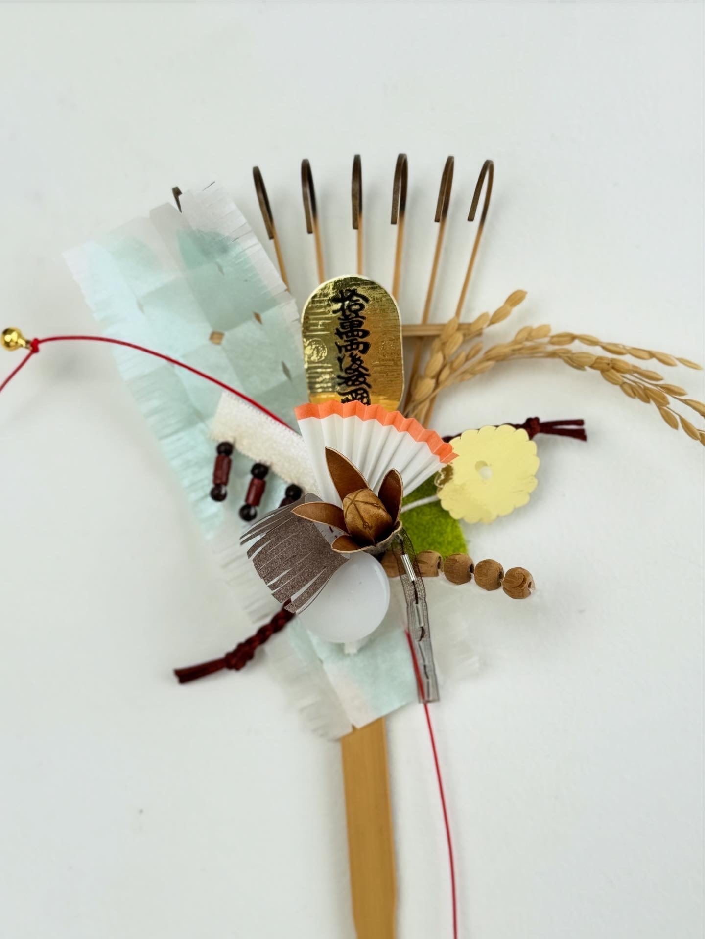 おめでたい屋さん 特別バージョンの熊手です。 お花やはるちゃん(fiore soffitta)と渡邉紘子が制作したり、集めた縁起物を組み合わせています。今年は来年の干支の「馬」をイメージしてモチーフを作りました。白〜ベージュ〜茶色の中にオレンジとグリーンが少し入る色合いに、さまざまな質感のものを散りばめています。