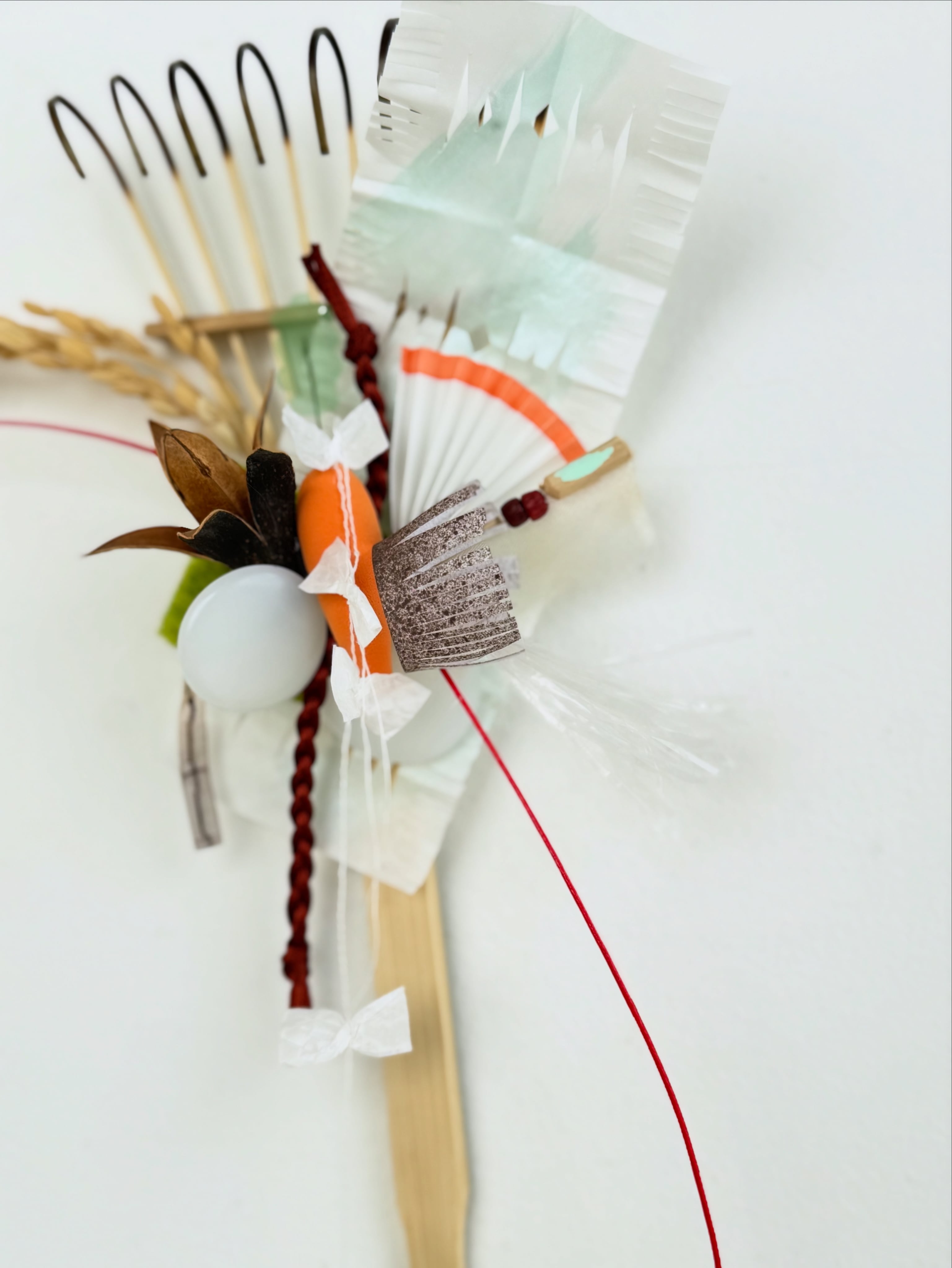 おめでたい屋さん 特別バージョンの熊手です。 お花やはるちゃん(fiore soffitta)と渡邉紘子が制作したり、集めた縁起物を組み合わせています。今年は来年の干支の「馬」をイメージしてモチーフを作りました。白〜ベージュ〜茶色の中にオレンジとグリーンが少し入る色合いに、さまざまな質感のものを散りばめています。