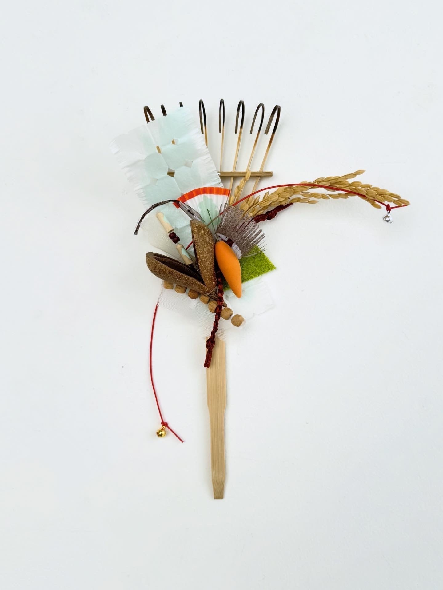 全ての熊手に必ず、うまのしっぽと芝生、稲穂、扇、きれいなおふだがついています。 それに様々な縁起物(詳しくは写真3-5枚目ご覧ください)を加えて、豪華に仕上げました。