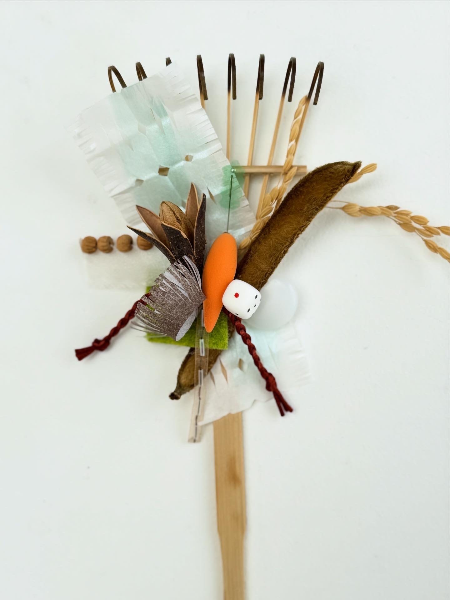 おめでたい屋さん 特別バージョンの熊手です。 お花やはるちゃん(fiore soffitta)と渡邉紘子が制作したり、集めた縁起物を組み合わせています。今年は来年の干支の「馬」をイメージしてモチーフを作りました。白〜ベージュ〜茶色の中にオレンジとグリーンが少し入る色合いに、さまざまな質感のものを散りばめています。