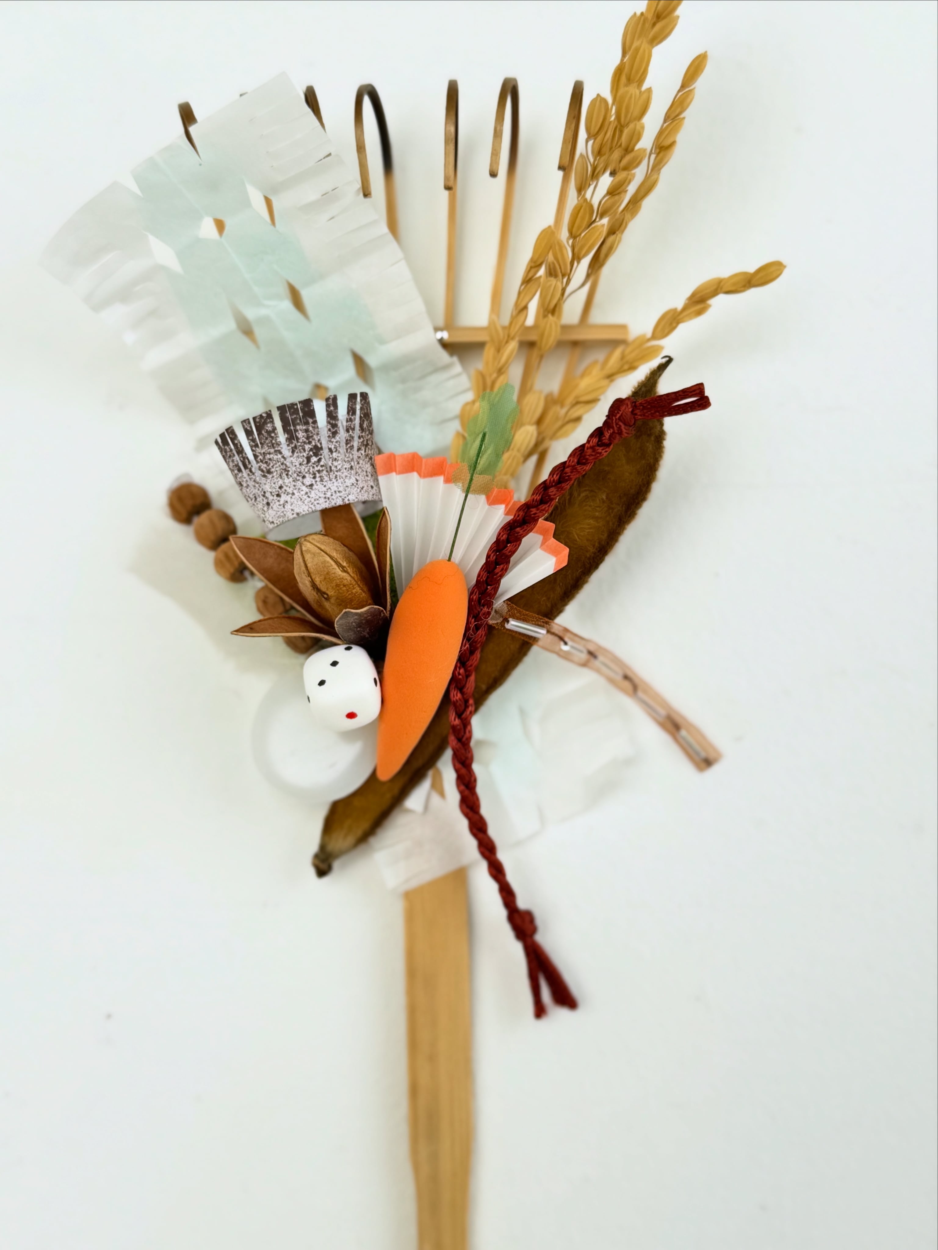 おめでたい屋さん 特別バージョンの熊手です。 お花やはるちゃん(fiore soffitta)と渡邉紘子が制作したり、集めた縁起物を組み合わせています。今年は来年の干支の「馬」をイメージしてモチーフを作りました。白〜ベージュ〜茶色の中にオレンジとグリーンが少し入る色合いに、さまざまな質感のものを散りばめています。